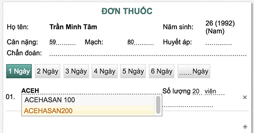 Gõ tên thuốc vào ô chọn thuốc, các thuốc có tên tương ứng sẽ lần lượt hiện ra để tùy chọn. Chọn thuốc bằng cách di chuyển mũi tên lên xuống và nhấn enter